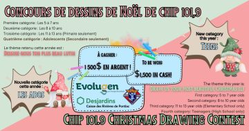 CONCOURS DE DESSIN CHIP 101.9 – ÉDITION 2025 ! Parents, à vos crayons ! C’est le grand retour de notre concours annuel et vos enfants sont invités à laisser parler leur imagination pour courir la chance de gagner une part de 1500 $ ! LE THÈME : DESSINE-NOUS TA PLUS BELLE BOULE DE NOËL Nous […]
