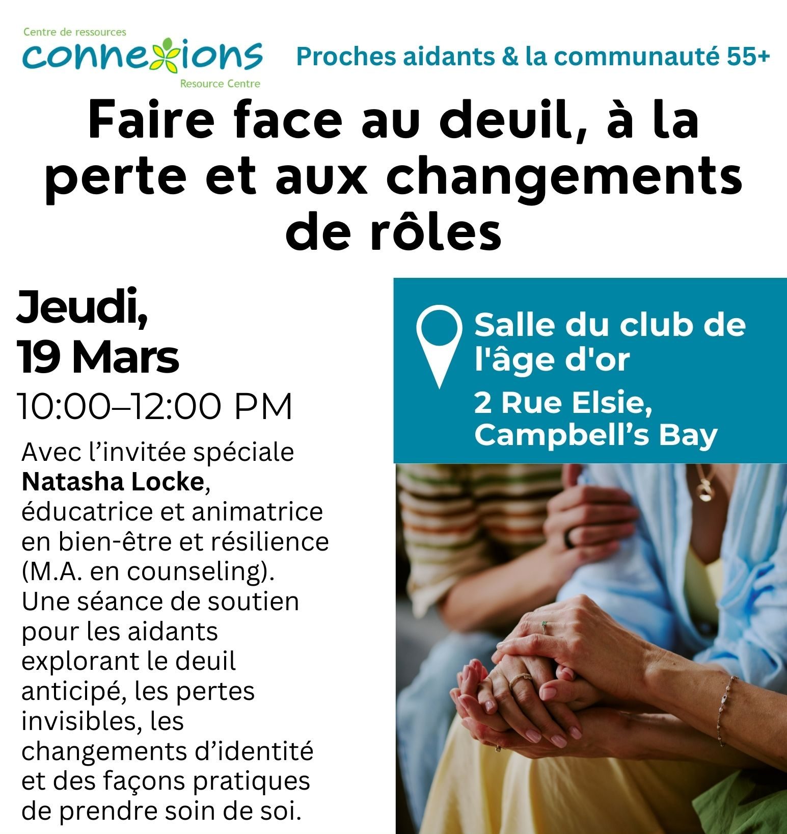 Centre de Ressource Connexions: Faire face au deuil, à la perte et aux changements de rôles “Le Centre de ressources Connexions accueillera Natasha Locke, éducatrice en mieux-être et en résilience, pour animer une séance sur le deuil, les pertes et les changements de rôle. L’activité est destinée aux proches aidants et aux aînés. La séance […]
