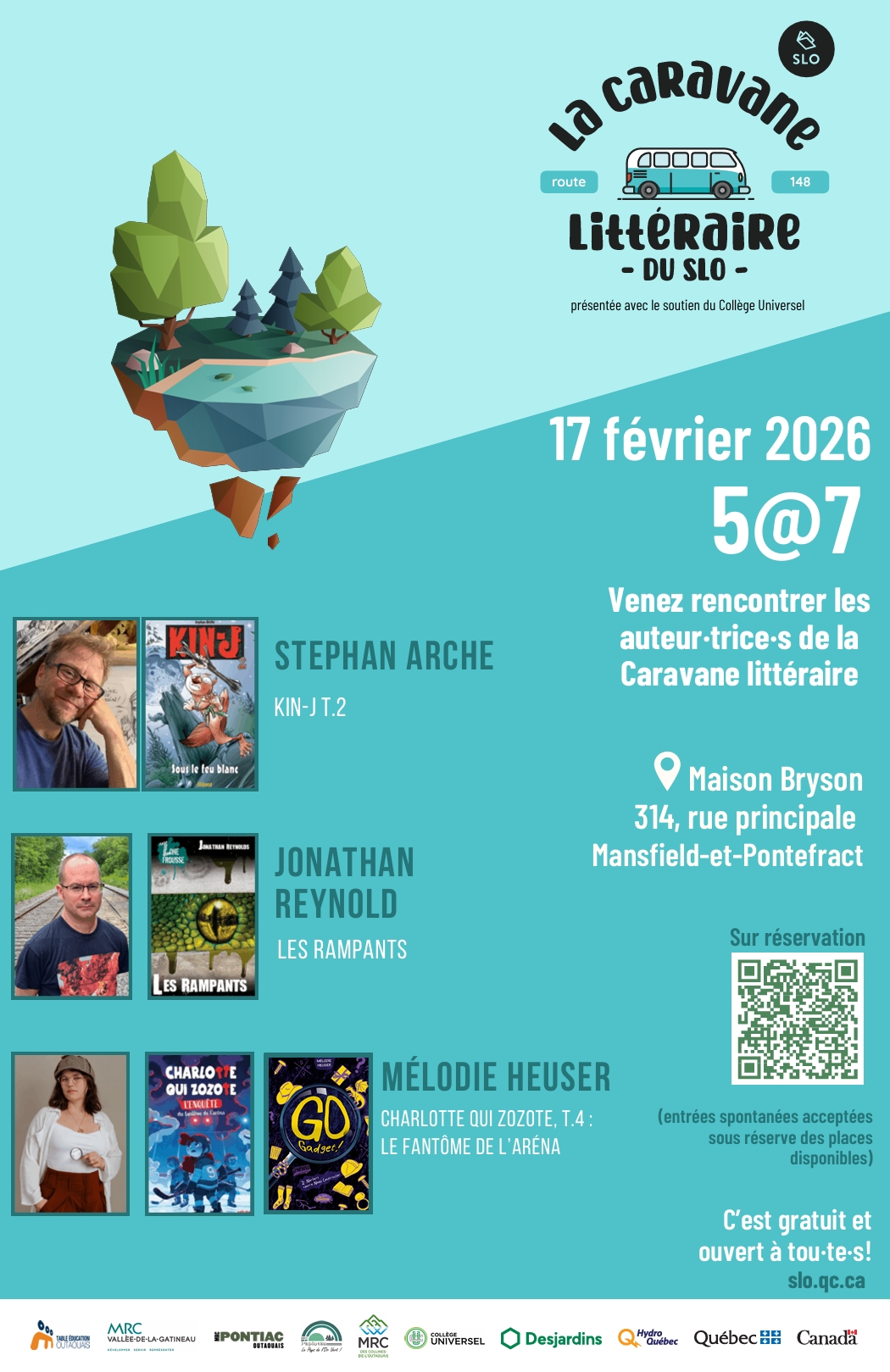 La Caravane littéraire du Salon du livre de l’Outaouais fera escale à Mansfield-et-Pontefract le 17 février 2026, dans le cadre d’un 5 à 7 littéraire à la Maison Bryson. Présentée avec le soutien du Collège Universel, cette rencontre gratuite invite le public à aller à la rencontre d’auteurs et d’autrices d’ici. Les participants pourront échanger […]