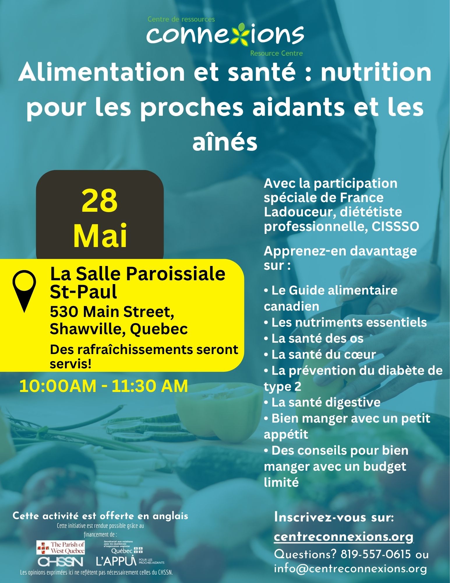 Le Centre de ressources Connexions tiendra une conférence dédiée à l’alimentation et à la santé des proches aidants et des aînés le 28 mai prochain, à Shawville. L’activité se déroulera de 10 h à 11 h 30 à la salle paroissiale St-Paul, située sur la rue Main. Elle mettra en vedette la diététiste professionnelle France […]