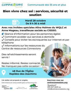 Le Centre de ressources Connexions, en collaboration avec le Western Quebec Literacy Council (WQLC) et le CISSSO, organise le 28 octobre prochain, un atelier gratuit intitulé « Bien vivre chez soi : services, sécurité et soutien », destiné à la communauté des 55 ans et plus.