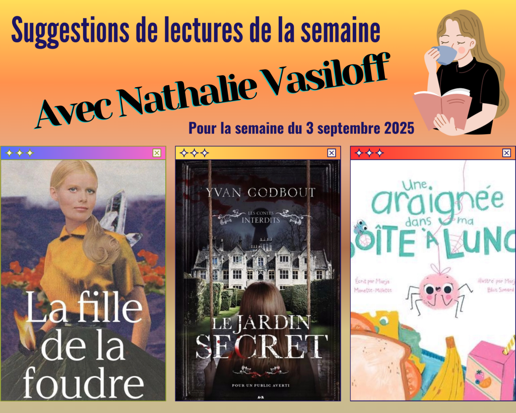 Une fois de plus cette semaine, notre animatrice, Nathalie Vasiloff, partage avec vous ses trois coups de coeur littéraires de la semaine. Les livres présentés cette semaine par Nathalie sont: La fille de la foudre – Gabrielle Boulianne-Tremblay – Éditions Marchand de feuille Le jardin secret – Yvan Godbout – Éditions ADA Une araignée dans […]