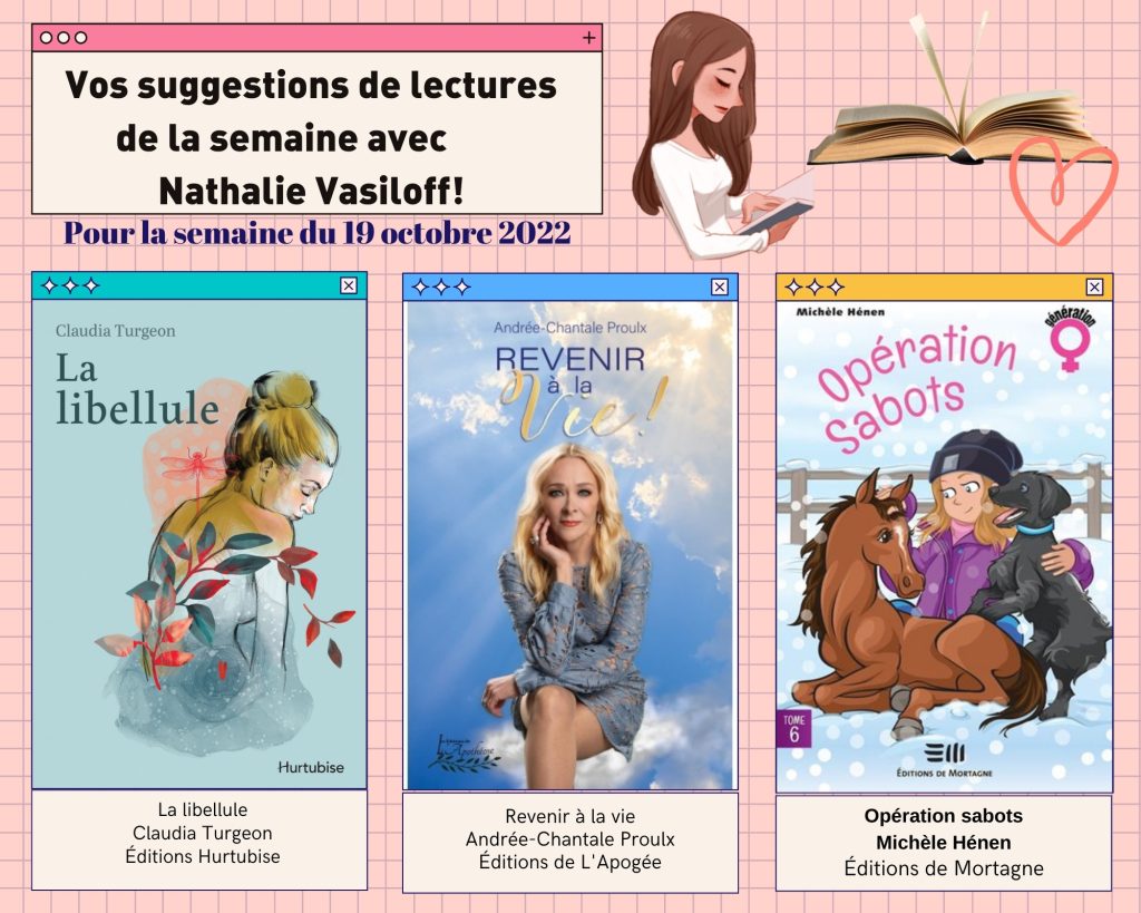 Une fois de plus, votre animatrice Nathalie Vasiloff vous suggère trois beaux livres qui ont retenu son attention. Bonne lecture! CHIP101.9 · Suggestions de lectures de la semaine du 19 octobre 2022 – Spécial avec l'autrice Claudia Turgeon