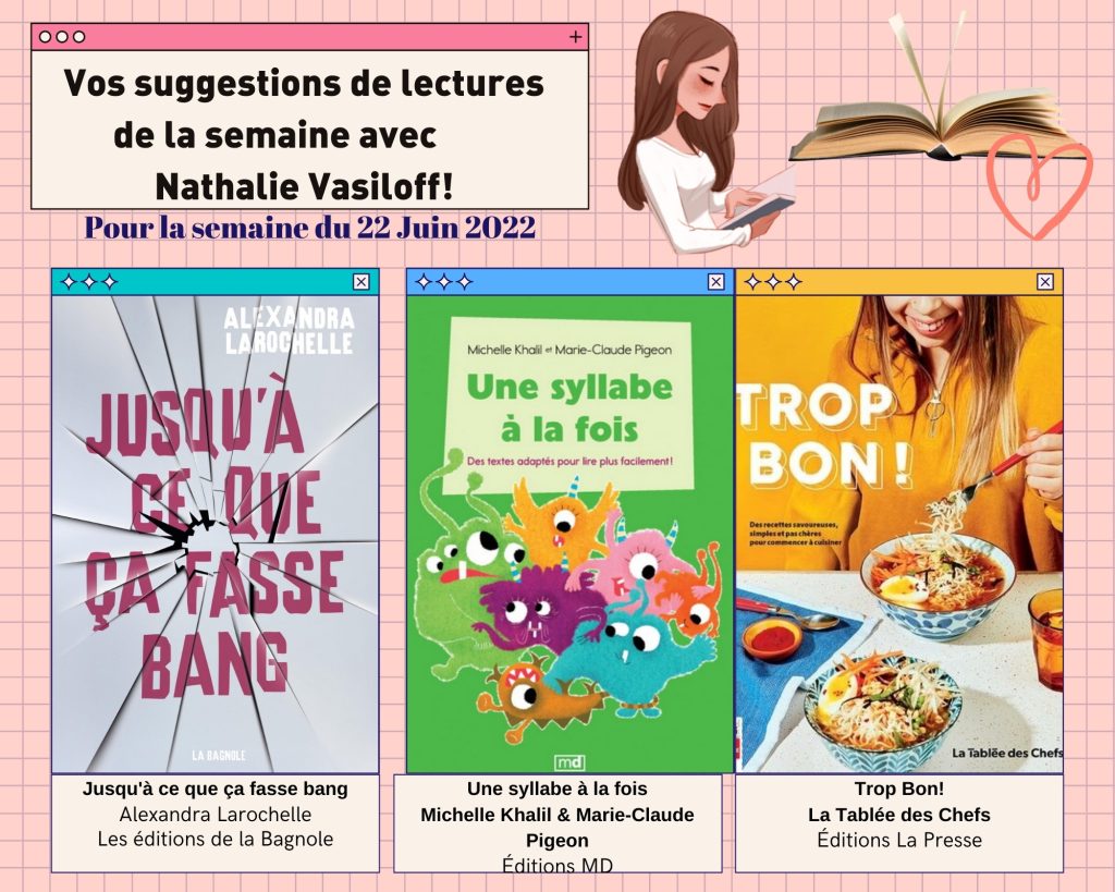 Encore une fois cette semaine Nathalie nous présente trois coups de coeur parmi les derniers livres parus et une belle entrevue avec l’autrice Alexandra Larochelle. Bonne lecture! CHIP101.9 · Suggestions de lectures de la semaine avec Nathalie Vasiloff – Spécial avec Alexandra Larochelle
