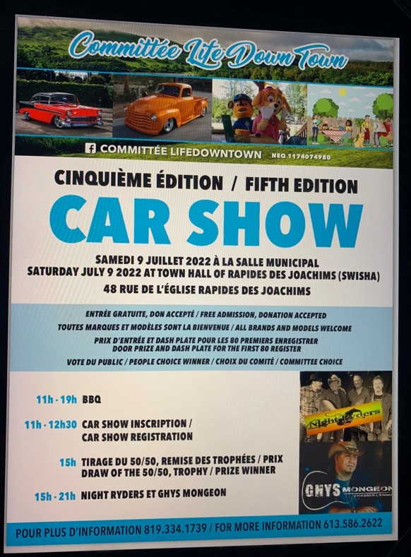 Le Commitée Life Downtown à Rapides-des-Joachims donne rendez-vous aux amateurs de belles voitures, de musique et aux familles le 9 juillet prochain. En effet, le Commitée Life Downtown organise une fois de plus cet été une journée remplie d’activités. En plus de l’exposition de voitures, les gens sont invités sur place dès 11 h, des structures gonflables […]