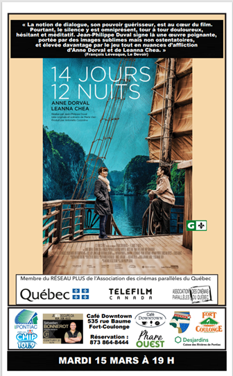 La prochaine soirée cinéma répertoire organisé par l’organisme Phare Ouest au Café Downtown à Fort-Coulonge, aura lieu le 15 mars prochain avec le film 14 JOURS 12 NUITS, du réalisateur Jean-Philippe Duval, mettant entre autres en vedette Anne Dorval. De l’organisme Phare Ouest, Louis Harvey, a invité les gens à se joindre à cette représentation et même à […]