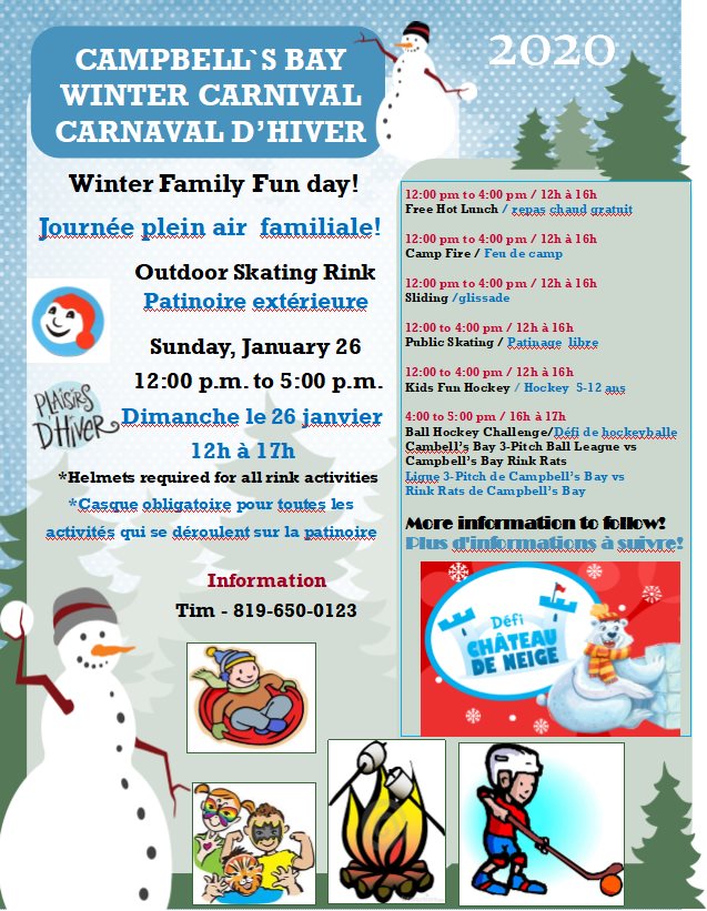 Le Carnaval d’hiver de Campbell’s Bay aura lieu ce dimanche 26 janvier de midi à 17h à la patinoire municipale, sur la rue Patterson. Pour l’occasion, le conseiller Tim Ferrigan, qui coordonne l’événement pour une année de plus, a donné plus de détails sur les différentes activités. Notons que les participants souhaitant patiner sur la […]