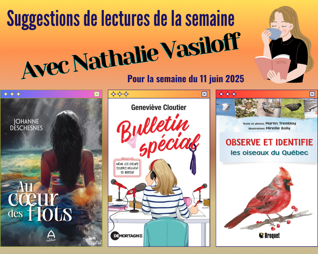 Comme à chaque semaine, notre animatrice chevronnée, Nathalie Vasiloff, partage avec nous ses trois coups de coeur littéraires de la semaine et nous propose une belle entrevue cette fois-ci avec l’autrice Johanne Deschesnes pour nous présenter son nouveau roman Au coeur des flots. Les livres présentés cette semaine par Nathalie sont: Johanne Deschesnes – Au […]