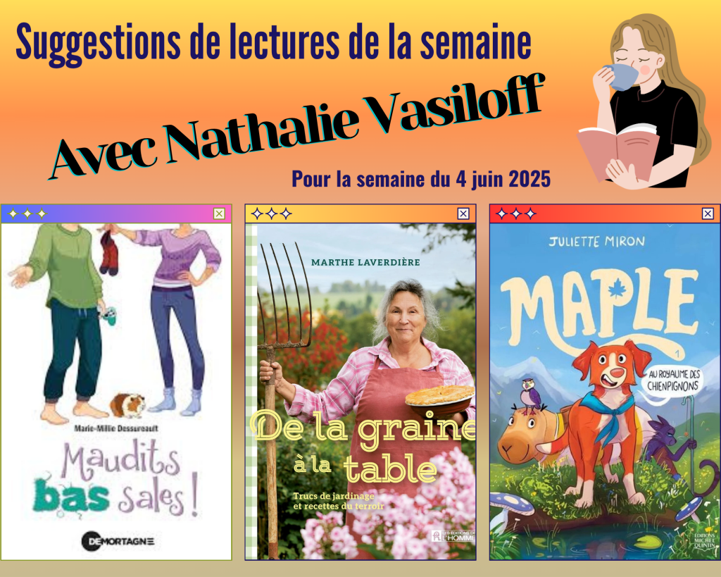 Nathalie partage avec nous ses trois coups de coeur littéraires de la semaine et nous propose une belle entrevue avec l’autrice Marie-Millie Dessureault pour nous présenter son nouveau roman. Les livres présentés cette semaine par Nathalie sont: Maudits bas sales – Marie-Millie Dessureault – Éditions de Mortagne De la graine à la table – Marthe […]
