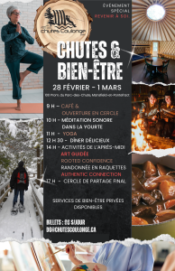 La prochaine retraite bien-être aux chutes aura lieu du 28 février au 1er mars 2026. Cette fin de semaine immersive est conçue pour permettre aux participant·es de ralentir et de se ressourcer grâce à la méditation par bain sonore, au yoga guidé, à des ateliers d’art accompagnés, à des excursions en raquette, à la cuisine sur le feu et à d’autres activités en nature favorisant le repos et le renouvellement.