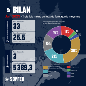 À l’image du printemps, le mois de juin s’est avéré plutôt calme pour la SOPFEU, avec un nombre d’incendies trois fois inférieur à la moyenne. Au cours du dernier mois, l’organisme de protection a enregistré 33 incendies ayant affecté 25,5 hectares (ha) de forêt en zone de protection intensive (ZPI), alors que la moyenne des dix dernières années est de 102,7 feux. Notons également que 97% des feux enregistrés en juin ont été causés par l’activité humaine.