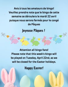 Le prochain MEGA Bingo sera le mardi 6 janvier à 19 h.