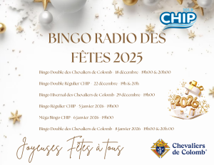 Nous vous recommandons fortement de ne pas jouer au bingo via l’internet à cause du délai dans la diffusion. CHIP 101,9 n’est pas responsable des pannes de courants et de leurs répercussions. Il est donc important de se munir d’une radio à pile et de lumières d’urgence.