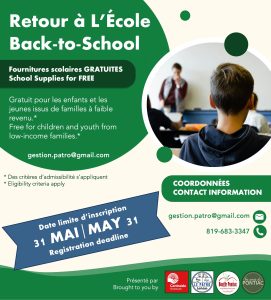 La date limite d’inscription est le 31 mai 2026. Les familles intéressées peuvent communiquer par courriel à gestion.patro@gmail.com ou par téléphone au 819-683-3347. Des critères d’admissibilité s’appliquent.