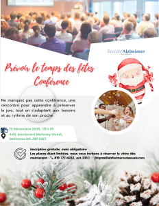 The Alzheimer Society of Outaouais is organizing a free conference to help caregivers of individuals living with Alzheimer’s disease or other neurocognitive disorders better prepare for the holiday season. The goal is to provide practical advice on adapting traditions, reducing fatigue, and preserving the joy of celebrations, while respecting the pace and needs of the person being cared for.