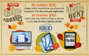 From October 1 to 31, the Réseau BIBLIO de l’Outaouais is organizing “The Great Member Hunt Contest”. Every time a patron borrow in October a document (print or digital book or magazine, video game, film DVD, board game) in one of the member libraries of the Réseau BIBLIO de l’Outaouais or on one of the digital platforms offered by the Réseau BIBLIO, he will have a chance to win one of the three regional prizes offered by filling out the contest form at their library or by completing it online at www.reseaubibliooutaouais.qc.ca/en/contest.