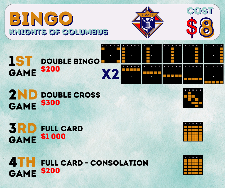 Knights of Columbus Council 7221 Bingo is held every Thursday at 7 p.m.