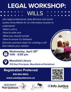 The session will be led by legal professional Jade Barrière and social worker Anny Martel. The goal is to better equip participants with the basics of wills and the essential steps to draft one properly and in accordance with legal requirements.