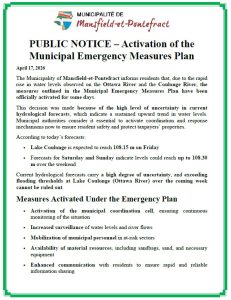 The Municipality of Mansfield-et-Pontefract has activated its emergency response plan due to the rapid rise in water levels observed on the Ottawa River and the Coulonge River.