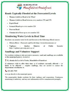 The municipality notes that several roads may be affected by rising water levels, including Thomas-Lefebvre Road, Esprit Road, Léonard Road, Pearson Road, and Passe Road.