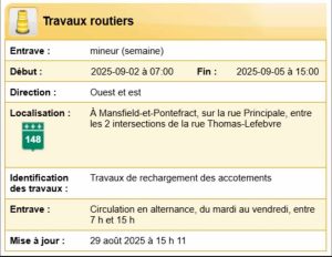 Roadwork in Mansfield-et-Pontefract for the Week of September 2–5th