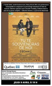 Pour cette projection, Phare Ouest convie le public à découvrir le film québécois Tu te souviendras de moi, le 9 avril à 19 h à la Maison George-Bryson à Mansfield.