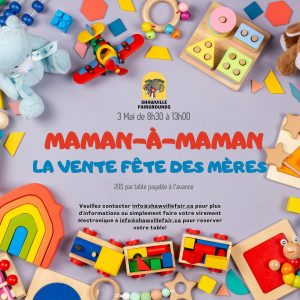 Si vous vous sentez envahis par les vêtements et les jouets qui ne conviennent plus à votre enfant ou ne l’intéressent plus, pensez à participer à la vente P.A.S. Maman-à-Maman. 3 Mai de 8h30 à 13h00 le weekend de fête des mères au terrain de la Foire.