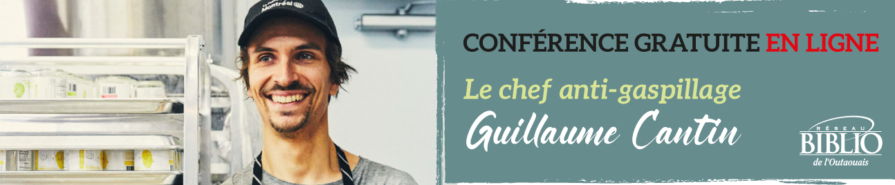 Pour de plus amples informations et modalités d’accès à la conférence, consultez le https://www.reseaubibliooutaouais.qc.ca/fr/activites-en-ligne/281/le-chef-anti-gaspillage-guillaume-cantin