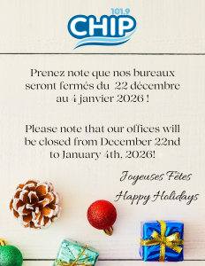 Horaire de fermeture des Fêtes pour les bureaux de CHIP 101.9