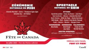 Les festivités du 1er juillet sur les Plaines LeBreton à Ottawa donneront l’occasion de célébrer notre unité et d’exprimer notre fierté nationale, tout en affirmant notre souveraineté, notre identité et notre culture. Cette année plus que jamais, c’est l’occasion parfaite de brandir fièrement notre drapeau canadien et de faire connaître au monde entier tout ce qui nous rend forts et fiers. Toute la communauté est invitée à prendre part aux festivités au cœur de la région de la capitale du Canada. En soirée, une vague de rouge et de blanc déferlera sur le parc des Plaines-LeBreton avec un spectacle qui enflammera la foule assemblée dans la capitale et résonnera aux quatre coins du pays, de 20 h à 22 h. L’animatrice de la soirée, Isabelle Racicot, nous donne un apperçu des têtes d’affiches:
