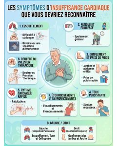 L’insuffisance cardiaque est une condition où le cœur n’arrive plus à pomper le sang de façon efficace pour répondre aux besoins du corps. Elle peut évoluer graduellement et présenter plusieurs signes et symptômes.