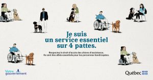 L’Office des personnes handicapées du Québec est fier de lancer sa nouvelle campagne de sensibilisation sous le thème « Les chiens d’assistance, des alliés essentiels ». Cette initiative vise à mieux faire connaître le rôle indispensable de ces chiens auprès du grand public et des donneurs d’accès (commerçants, restaurateurs, chauffeurs, employeurs, propriétaires de logements, etc.) ainsi qu’à rappeler l’importance de respecter leur droit d’accès.
