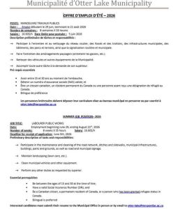 La Municipalité d’Otter Lake annonce une offre d’emploi d’été 2026 pour un poste de manœuvre en travaux publics.