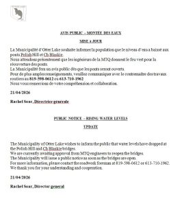La Municipalité d’Otter Lake informe la population que le niveau d’eau a maintenant diminué aux ponts Polish Hill et Chemin Blaskie, à la suite de la période de crue.