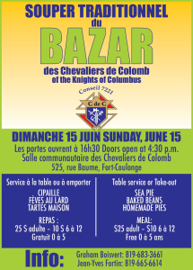 Le souper traditionnel du Bazar, organisé par les Chevaliers de Colomb du Conseil 7221, revient en force, dimanche le 15 juin prochain pour la fête des pères à la salle des Chevaliers de Colomb à Fort-Coulonge. Le Chevalier Gilles Dionne nous donne les détails du souper: