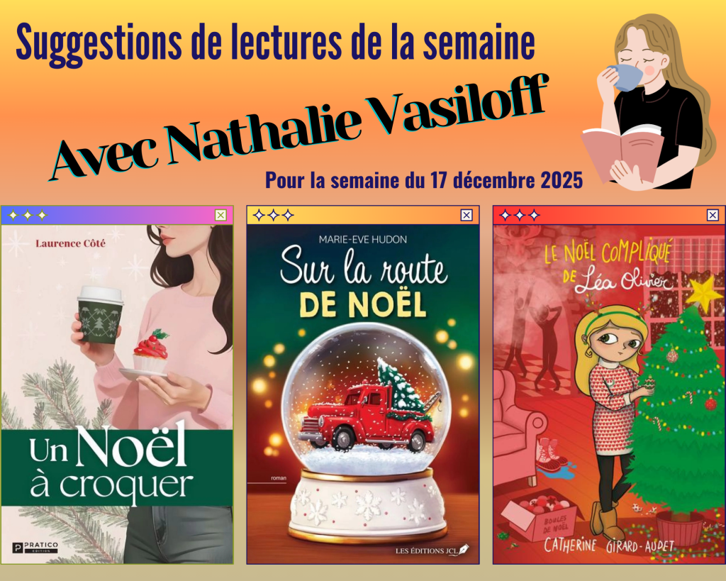 Notre animatrice chevronnée Nathalie Vasiloff, partage avec vous trois belles nouveautés littéraires de la semaine. Les livres présentés cette semaine par Nathalie sont: Romance (et autres saveurs) de Noël – Josyane Bissonnette – Les éditeurs Réunis Evelyne, mère célibataire fraîchement séparée, traverse une période éprouvante à l’approche du temps des fêtes : c’est le premier […]