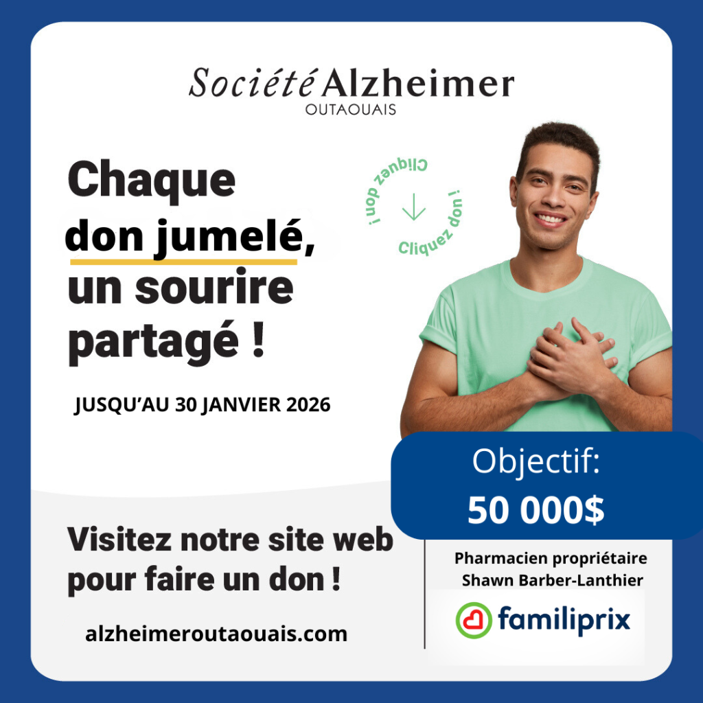 La Société Alzheimer Outaouais lance officiellement sa Campagne de dons jumelés. Une occasion unique de multiplier l’effet de votre contribution et d’avoir un impact direct sur les personnes vivant avec un trouble neurocognitif et leurs proches aidants. Jusqu’au 30 janvier 2026, chaque don fait à la Société Alzheimer Outaouais sera jumelé dollar pour dollar, jusqu’à […]