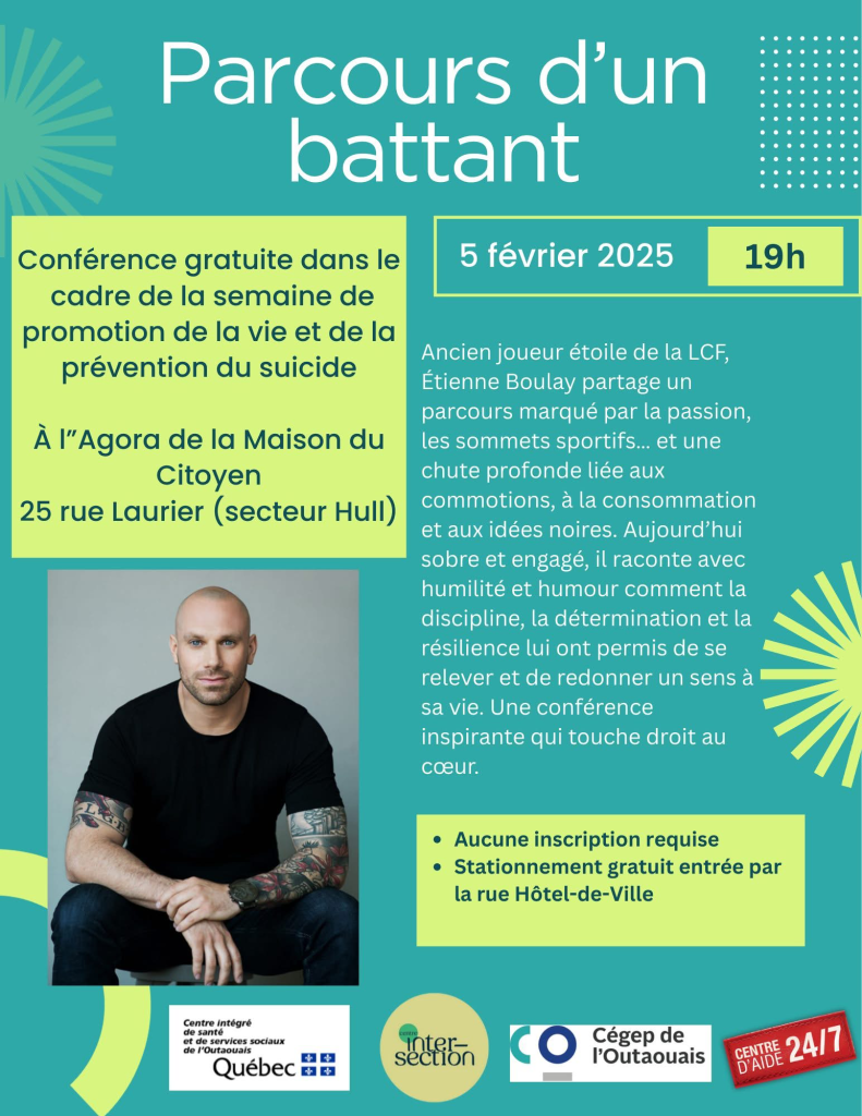 Dans le cadre de la semaine de promotion de la vie et de la prévention du suicide, la population est invitée à assister à la conférence gratuite Parcours d’un battant, qui se tiendra le 5 février 2025 à 19 h, à l’Agora de la Maison du Citoyen, au 25 rue Laurier, dans le secteur Hull. […]
