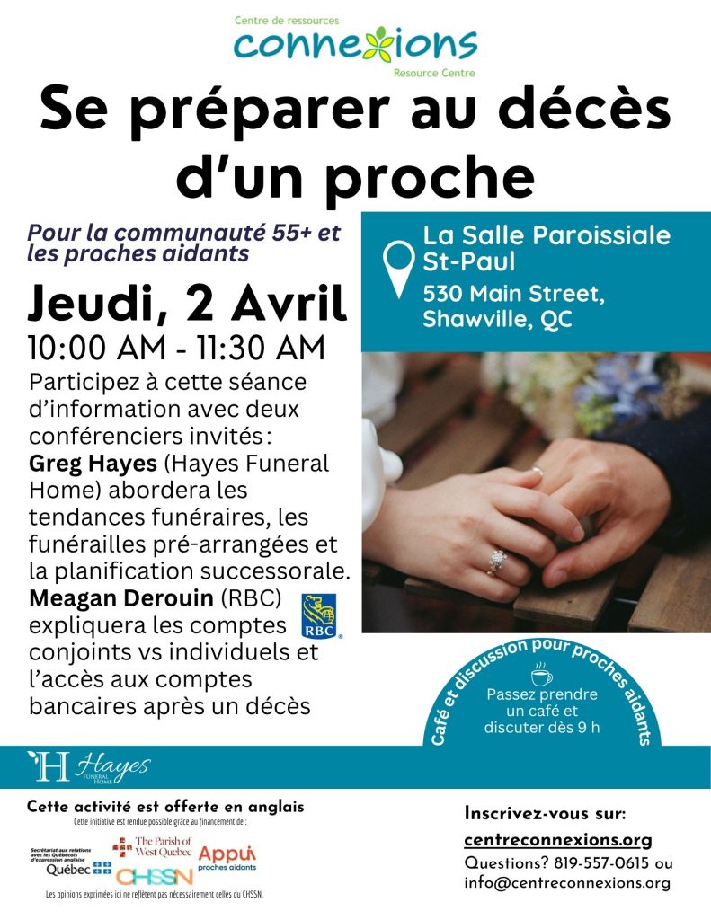 Le Centre de ressources Connexions invite les aînés et les proches aidants à participer à une séance d’information portant sur la préparation au décès d’un proche. L’événement se tiendra le jeudi 2 avril, de 10 h à 11 h 30, à l’église anglicane St-Paul. Pour l’occasion, deux conférenciers invités seront présents : Greg Hayes, qui […]