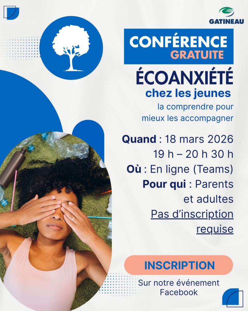 Une conférence gratuite en ligne portant sur l’écoanxiété chez les jeunes sera présentée le 18 mars 2026, de 19 h à 20 h 30, à l’initiative de l’organisme Enviro Éduc-Action. L’activité vise à mieux faire comprendre ce phénomène grandissant chez les jeunes, lié aux préoccupations face aux changements climatiques et à l’environnement. Les organisateurs souhaitent […]