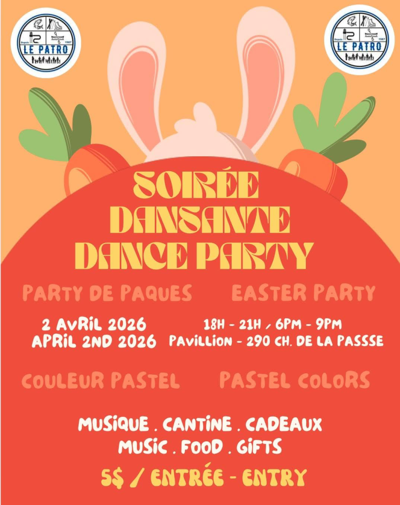 À l’occasion de la fête de Pâques, le Patro organise une soirée dansante festive ouverte à tous. L’événement se tiendra le 2 avril 2026, de 18 h à 21 h, au pavillon situé au 290, chemin de la Passe. Sous le thème des couleurs pastel, petits et grands sont invités à participer à cette soirée […]