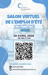 Le 29 avril 2026, de 10 h à 14 h, les chercheurs d’emploi de la région du Pontiac auront l’occasion de rencontrer des employeurs locaux lors du Salon virtuel de l’emploi d’été.