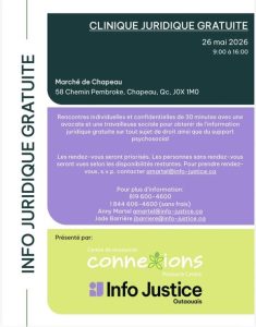 Les citoyens de la région sont invités à profiter d’une clinique juridique gratuite sans rendez-vous le 26 mai 2026, de 9 h à 16 h, au Marché de Chapeau (58 chemin Pembroke).