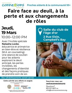 Centre de Ressource Connexions: Faire face au deuil, à la perte et aux changements de rôles “Le Centre de ressources Connexions accueillera Natasha Locke, éducatrice en mieux-être et en résilience, pour animer une séance sur le deuil, les pertes et les changements de rôle. L’activité est destinée aux proches aidants et aux aînés. La séance aura lieu le jeudi 19 mars, de 10 h à 12 h, au Club d’âge d’or de Campbell’s Bay, situé au 2, rue Elsie.